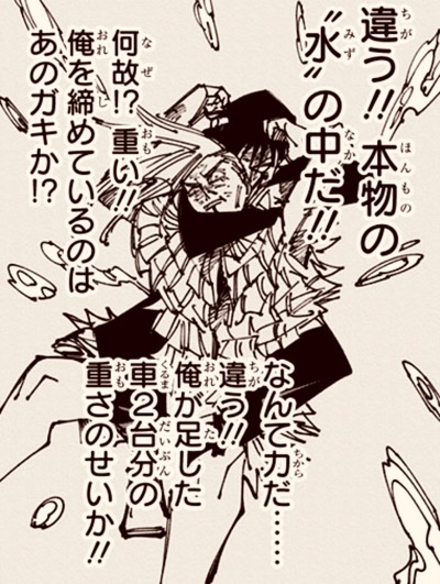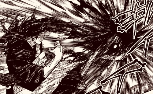 재미있는건 고죠도 시부야에서 이런 (실제)무게연출이 나왔다는 것임. 옥문강이 고죠의 정보를 처리하기 버거워 무거워서 들 수 없어서 켄자쿠가 버티다가 메이메이를 만남. 25권에서는 스쿠나를 상대할때 유독 쿵쿵거리며 싸우기까지함. 그전까지 공중에 떠 있는 연출이 많았던 만큼 의아한 부분.