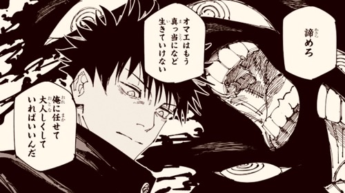 그리고 그 권한을 가지게 된건 마허라를 소환한 시점부터임. 머리를 친 이유부터가 ‘자격요건’을 시험한 것 같음. 연출과 달리, 설정으로는 스쿠나가 마허라를 쓰러뜨려서 조복한건 인정되지 않으니까. 메구미가 살아있어서 조복으로 인정된 셈. 그러니까 마허라를 조복하는 게 곧 그림자를 다루는 열쇠가 되는 것