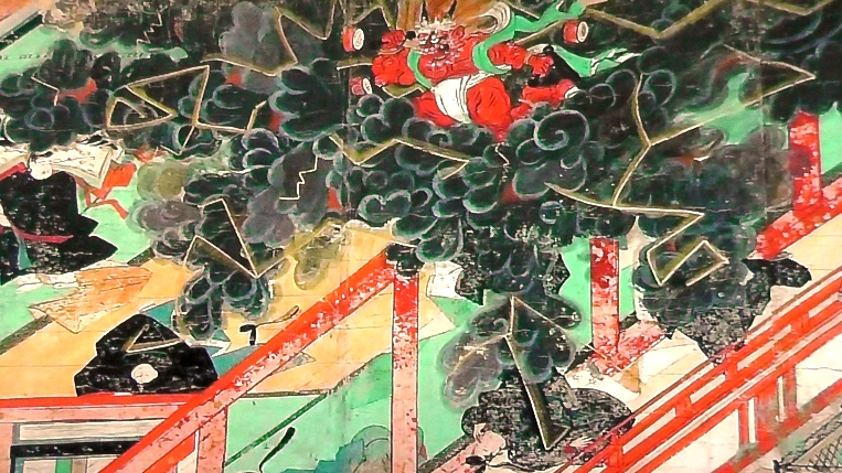 상단의 그림이 스가와라노 미치자네가 ‘원령’이 되었다고 여겨 그린 그림임. 자세히보면 뿔이 있다.